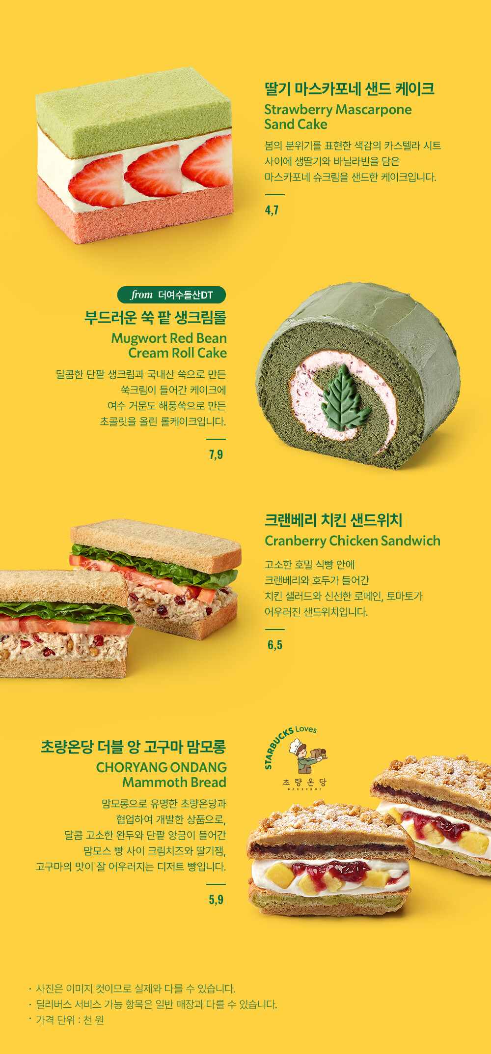 - 쑥 팥 크림 롤 케이크 : 쑥의 향긋함과 달콤한 팥크림이 어우러진 롤 케이크랍니다.