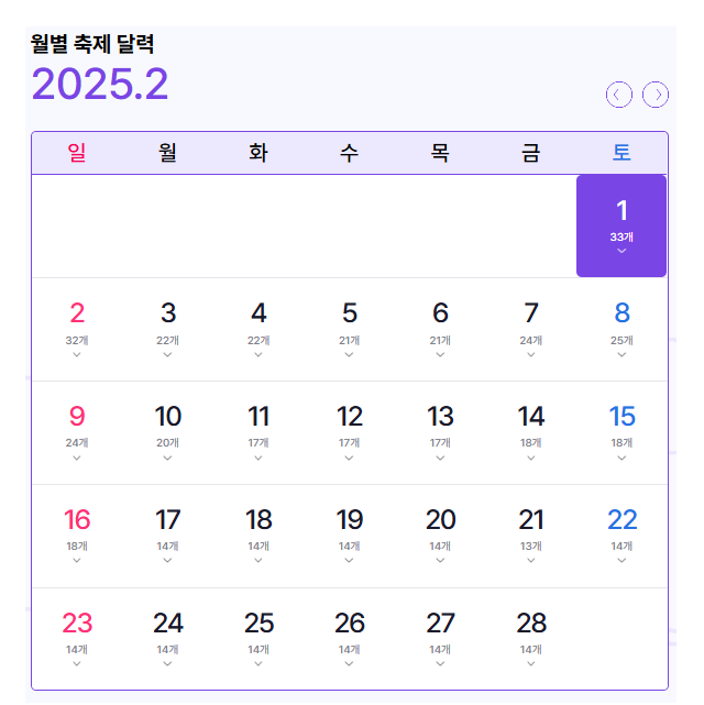 해당날짜에 할수있는 축제수가 달력에 표시되어있어요 !! 아래대한민국 구석구석 축제 홈페이지를 참고해주세요!!!